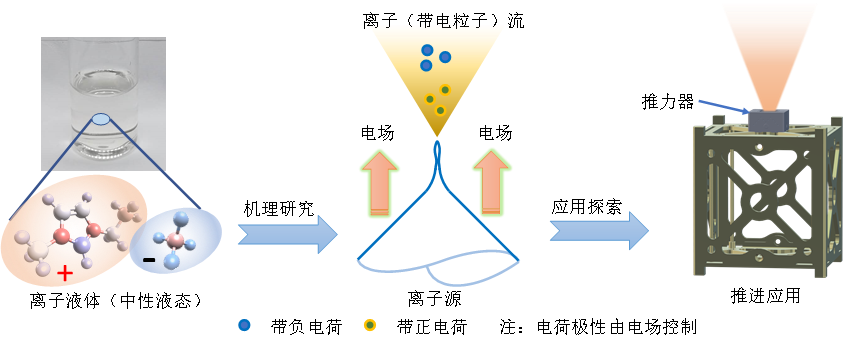 离子液体是一种由有机阳离子和有机或无机阴离子组成的固液转变温度(熔点或玻璃化转变温度)低于100℃的低温熔盐,具有真空不挥发,宽液态范围、绿色无毒等众多空间推进应用中理想的性质。通过合理控制外加电场可以将离子液体直接从液相转换成高速带电粒子(离子、离子簇、带电液滴)并产生推力,从而避免了传统气相电离推进方式中电子自由程对推力器尺寸的限制,以及碰撞电离带来的能量损失和复杂推力器结构。因此,离子液体电推进具有全面突出的潜在性能优势,是微纳卫星极具吸引力的动力解决方案。离子液体电推力器对结构部件的极致简化要求是工程应用的理想状态,但在其“简单”外表下的复杂机理问题,是研究人员必须深入探索理解以实现对更简单结构有效控制的基石,也是其背后更为复杂且极具魅力的科学本质。本项目在西北工业大学博士论文创新基金资助下,以空间推进应用的重要需求为牵引,深入开展离子液体电致发射机理研究,探索离子液体电推进应用。