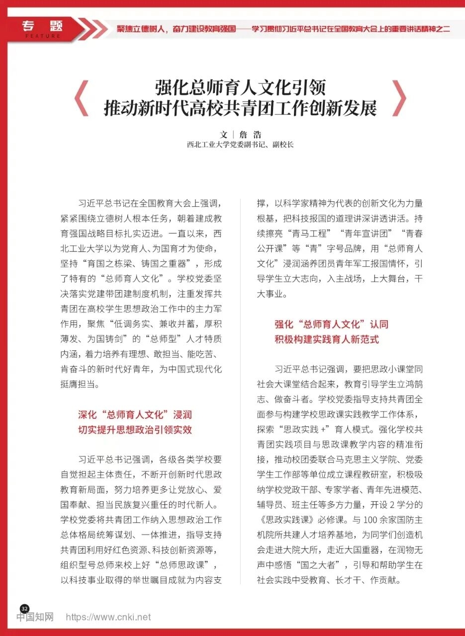 《中国共青团》《中国青年报》发表文章《强化总师育人文化引领推动新时代高校共青团工作创新发展》