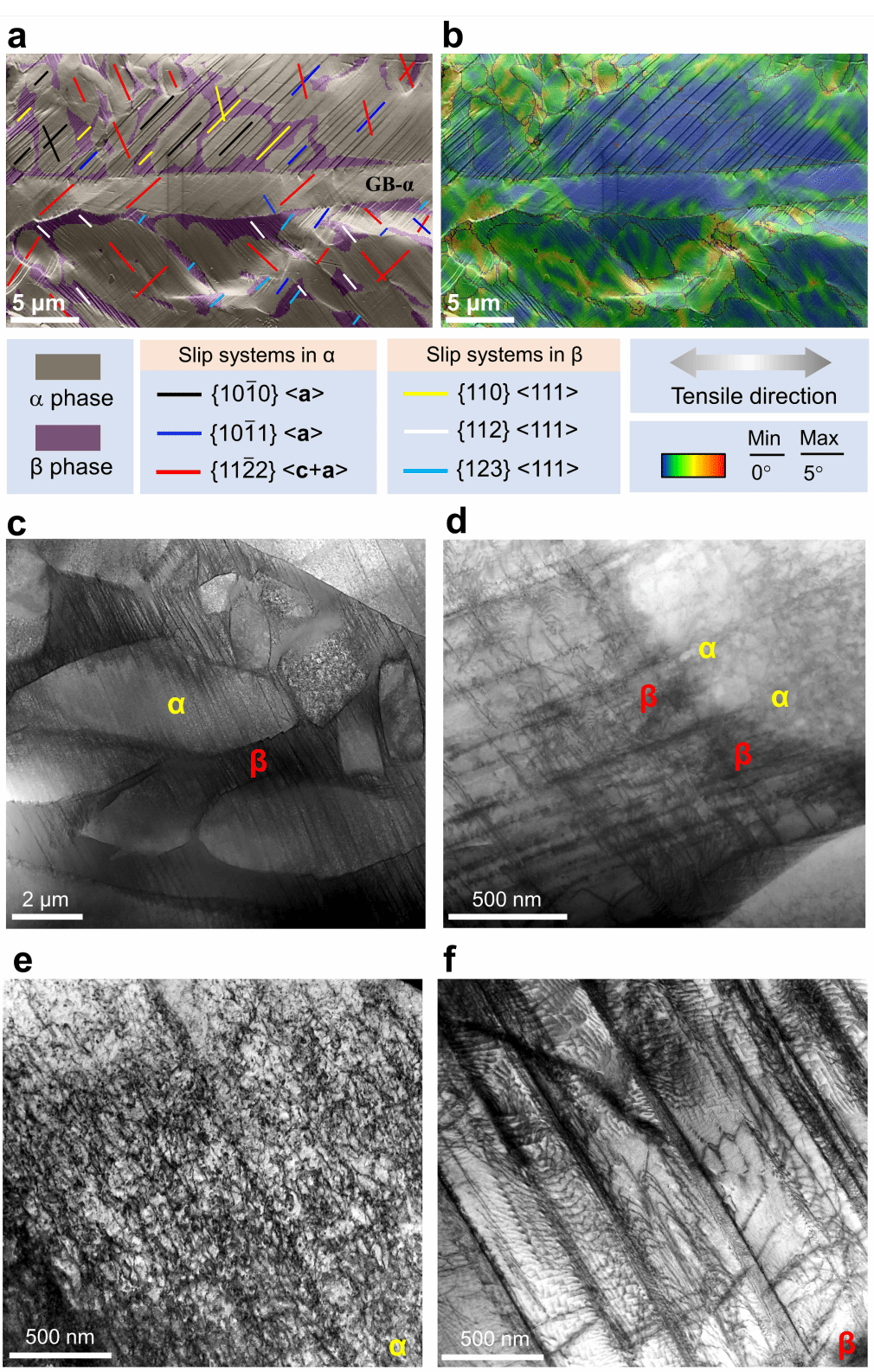 图5.α-β Ti-0.45O-4Fe合金(PBF-LB+800°C退火1小时)在拉伸变形过程中的位错活动。