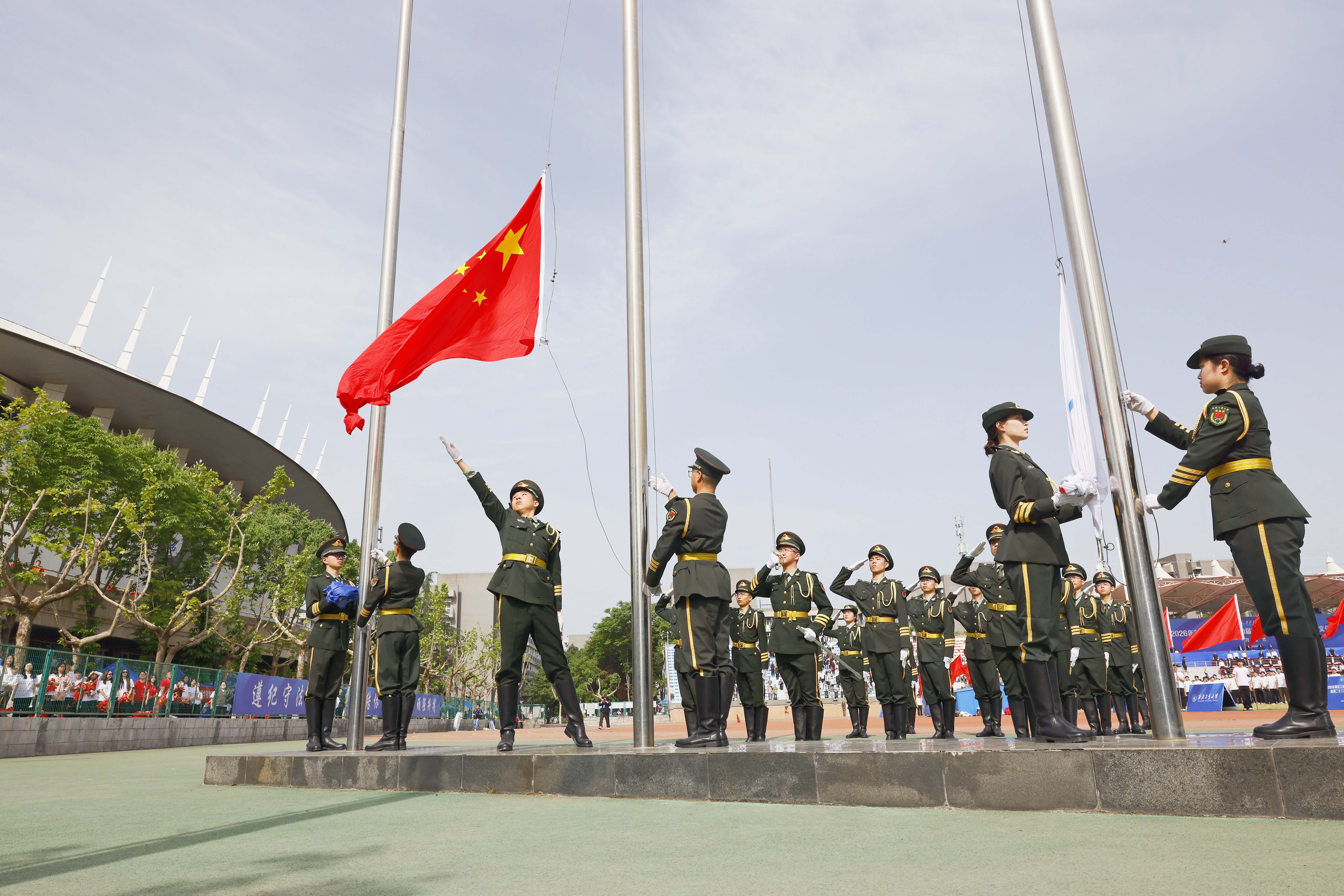 在慷慨雄壮的校歌声中,奥林匹克旗和校旗相继升起。